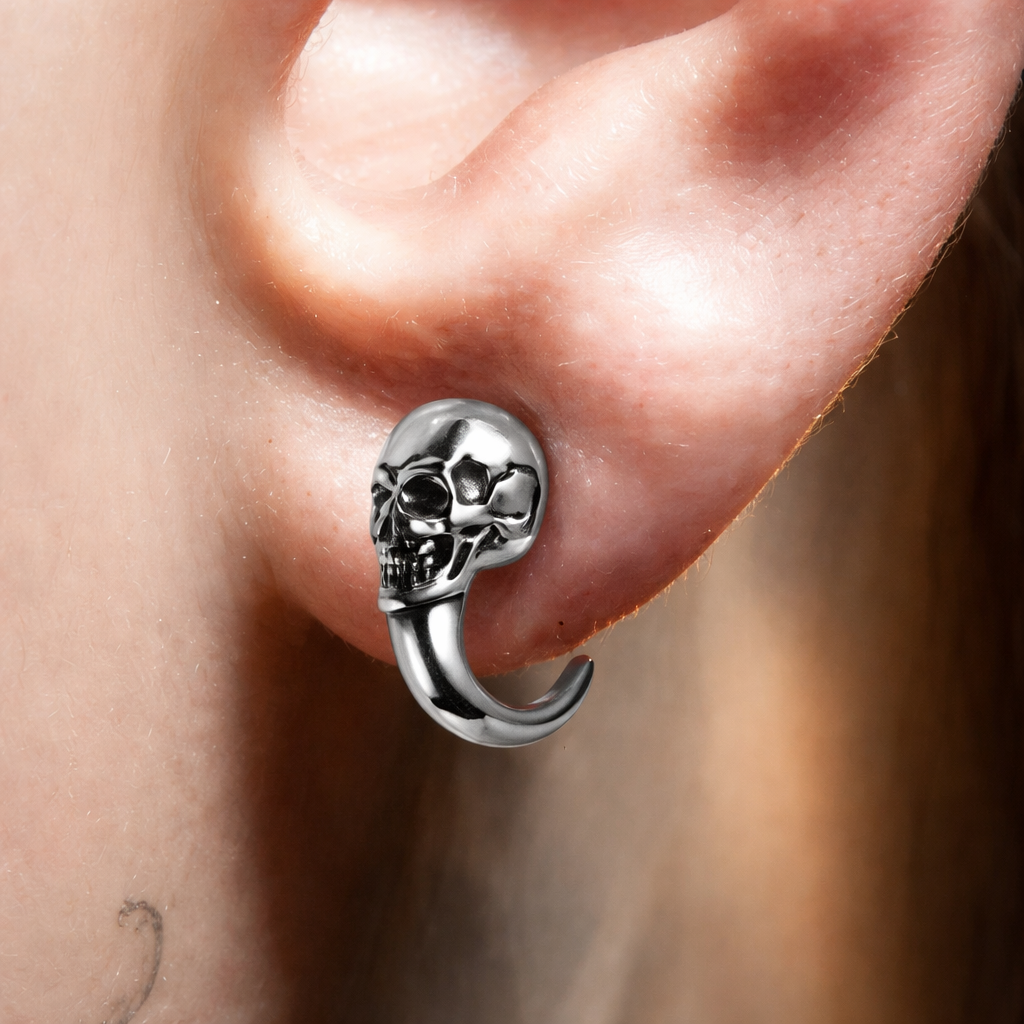 Cette boucle d’oreille homme en acier inoxydable est le choix parfait pour compléter une tenue sombre, urbaine ou alternative tout en affirmant une identité forte.